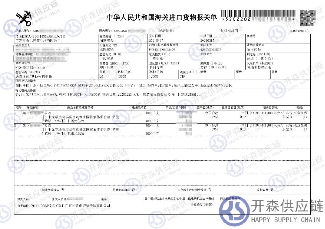 【導讀】您正在閱讀的是關于臺灣粘合劑進口報關清關代理服務【經典案例】的內容,本文由開森化工品進口報關代理小編整理編寫;
