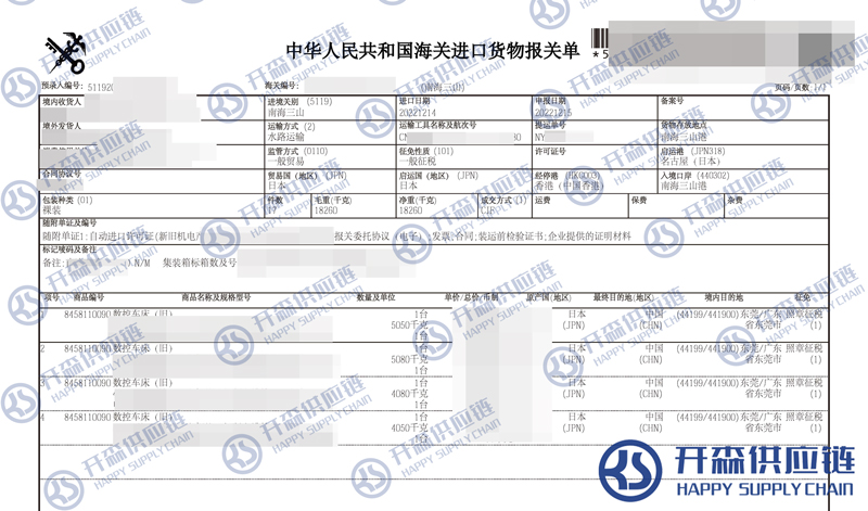 【本文結語】 上述就是佛山港二手舊數控車床進口報關代理服務【經典案例】的全部內容,希望能對您有所幫助,如有舊數控機床進口報關上任何疑問及問題可隨時在線聯系我們或撥打 18002611553,開森供應鏈擁有豐富的舊數控機床進口報關操作經驗及案例,10余年進口經驗為您所用,各類進口疑難都能為您一一解答及協助快速處理解決!