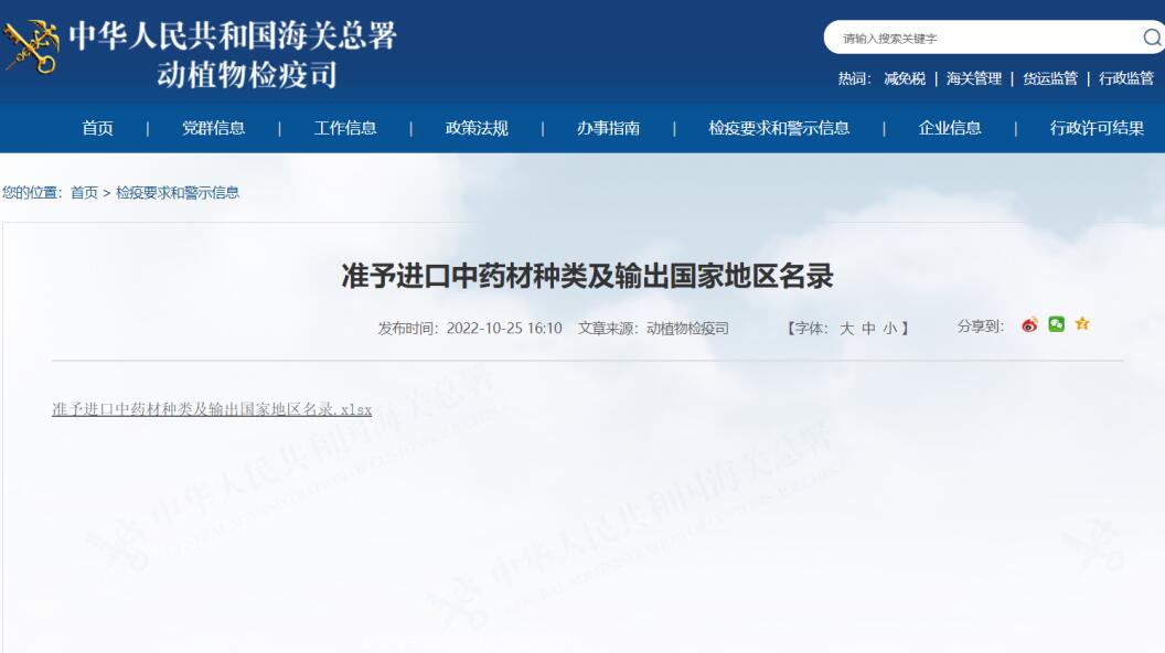 海關(guān)總署對進(jìn)境中藥材實施檢疫準(zhǔn)入制度,包括產(chǎn)品風(fēng)險分析、監(jiān)管體系評估與審查、確定檢疫要求、境外生產(chǎn)企業(yè)注冊登記以及進(jìn)境檢疫等。目前,我國已準(zhǔn)予91個國家、地區(qū)的上百種中藥材,企業(yè)可在海關(guān)總署—動植物檢疫司—檢疫要求和警示信息(http://dzs.customs.gov.cn/dzs/2746776/4445554/index.html)查詢準(zhǔn)予進(jìn)口中藥材種類及輸出國家地區(qū)名錄信息(也可咨詢開森供應(yīng)鏈,我們將為您提供最新詳細(xì)名單目錄)